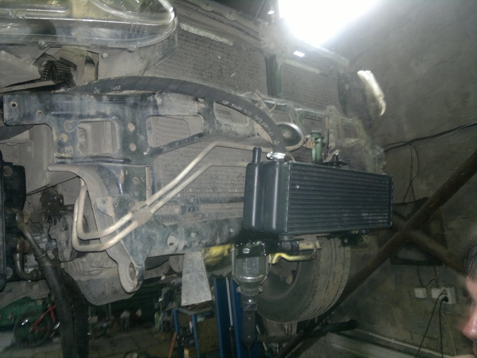 Во время установки интеркулера выяснилось, что при его установке остается очень маленькое расстояние от него до двигателя, а сверху прижимает капот. Вследствие чего принято решение данный интеркулер заменить на более тонкий, который уже заказан в Пиндосии.На фотографиях установка радиатора и помпы для интеркулера.Использована усиленная электрическая помпа газели и четырехрядный радиатор печки от УАЗа. Так же для соединения всей системы приобретены маслостойкие шланги и медная трубка.Глушить в процессе производства.